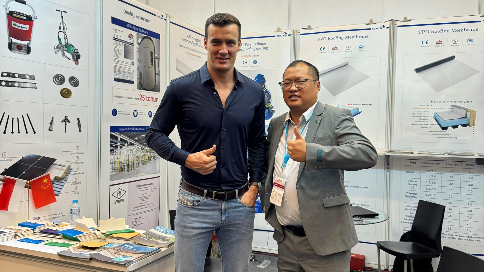 Jedním z klíčových momentů naší návštěvy byla schůzka s reprezentanty čínské společnosti Canlon, která je světovým lídrem v oblasti hydroizolací. Na výstavě byly prezentovány nejen vzorky jejich špičkových PVC membrán, ale také fotodokumentace přímo z Bali, kde produkty Canlon využíváme na našich stavbách.